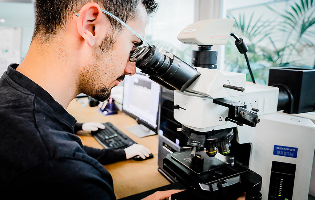 Al termine delle operazioni di inglobatura, smerigliatura e lucidatura del provino ricavato dal campione di origine, gli Operatori del Laboratorio Prove procedono con un esame visivo mediante microscopio di tutta la superficie lucidata e non attaccata.