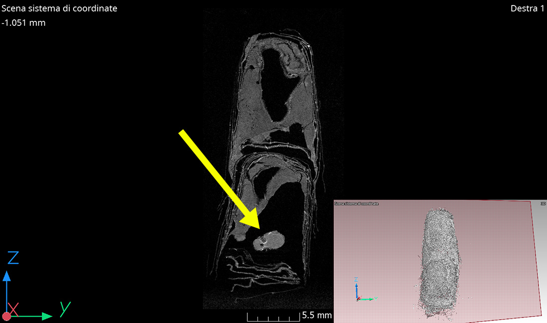 Una volta eseguita la scansione mediante Tomografia Computerizzata e dopo aver ricostruito il volume tramite il software dedicato è stato possibile identificare non solo i differenti strati dei petali incastonati tra loro e i materiali di composizione del nido, ma è stata documentata anche la presenza di una possibile larva al suo interno (indicata in figura dalla freccia gialla)