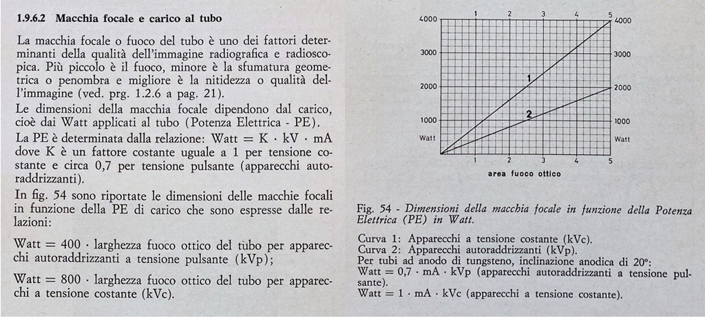 “La macchia focale (o fuoco del tubo) è uno dei fattori determinanti della qualità dell’immagine radiografica e radioscopica. Più piccolo è il fuoco, minore è la sfumatura geometrica o penombra e migliore è la nitidezza o qualità dell’immagine. Le dimensioni della macchia focale dipendono dal carico, cioè dai Watt applicati al tubo (Potenza Elettrica PE).”