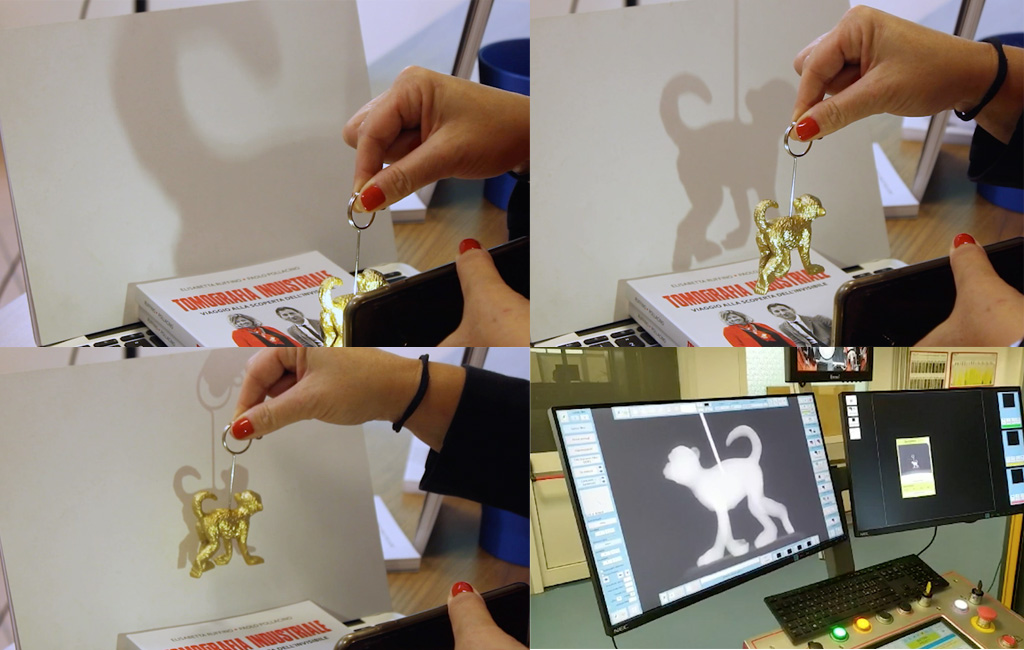 L’immagine riprende l’esempio citato mediante un simpatico portachiavi, uno sfondo e una luce (cellulare). Evidenzia il il rapporto tra fuoco, potenza e distanza. Nell’ultima immagine in basso a destra, l’oggetto (portachiavi) inserito nella camera tomografica di MotivexLab