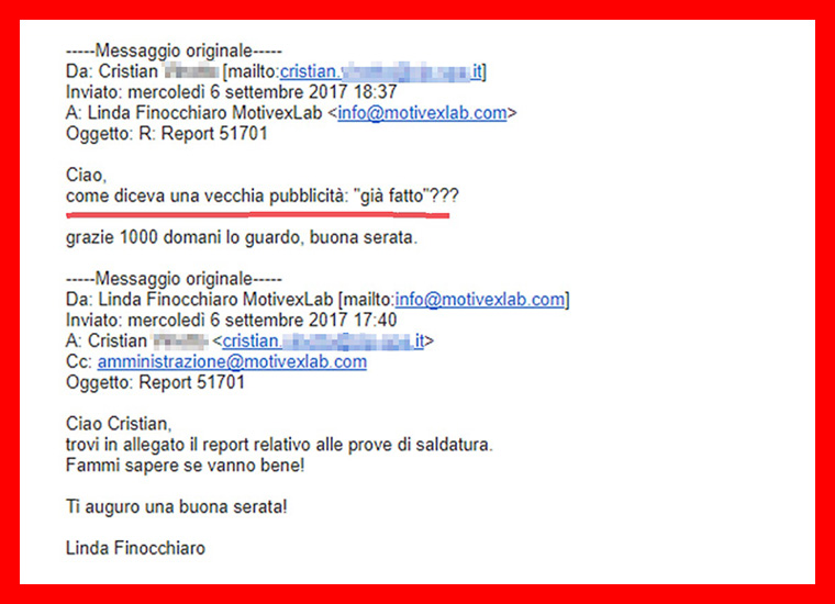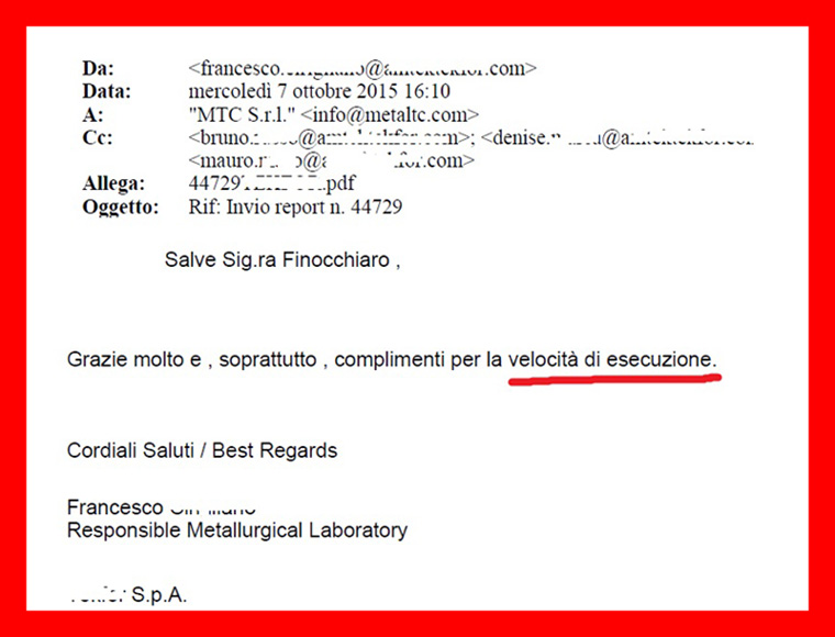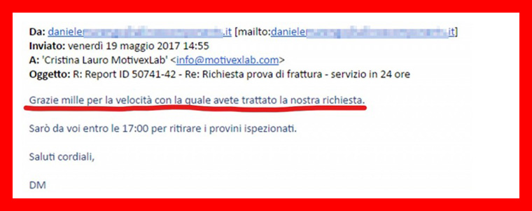 che ha sposato la mia stessa filosofia  mi fa molto piacere e mi fa scegliere MotivexLab come partner per le prove metallurgiche, inoltre riesce a darmi responsi tecnici in 24 ore.”