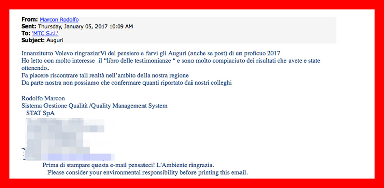 Per il servizio ricevuto come prima volta, mi sento di dire di continuare in questa linea e voglio fare i miei complimenti per il lavoro svolto.”